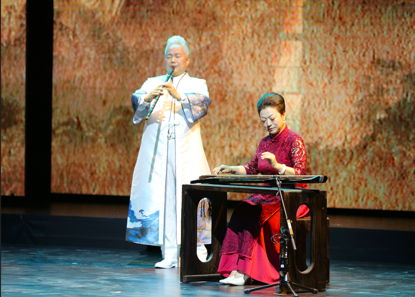 ·古琴演奏家张维娜(右)与方锦龙合奏《僧踪》。(库车市融媒体中心 蔡蔬 / 摄)