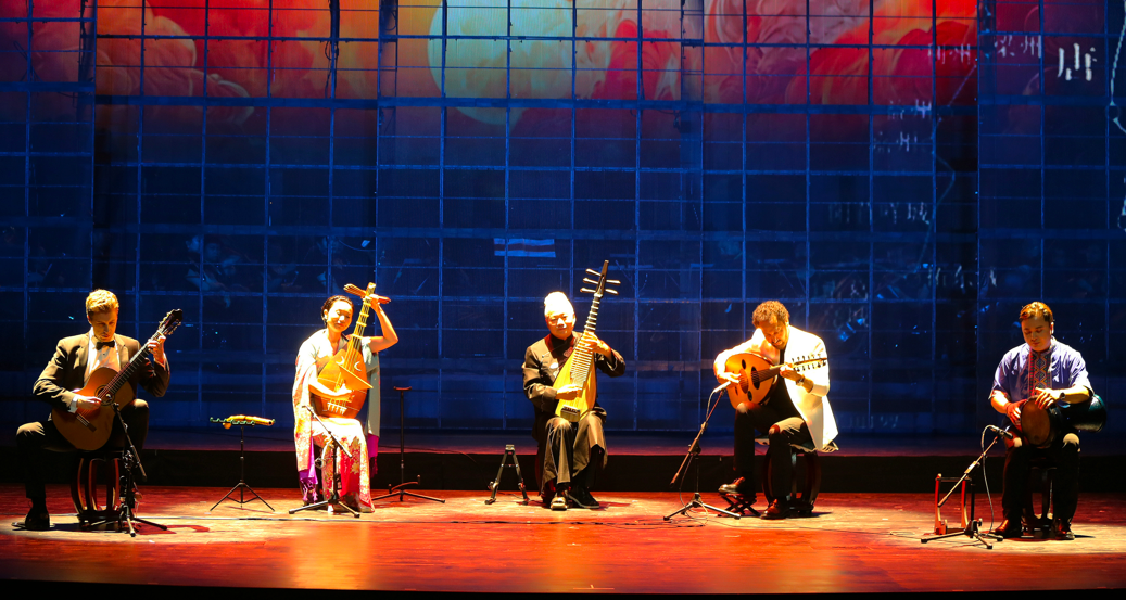 乐章尾声,方锦龙与各国艺术家共同奏响《库车丝路行》。五弦琵琶的延绵音韵、乌德琴的意蕴悠远、尺八的幽然思古、古典吉他的柔情万缕,完美诠释了“各美其美,美美与共”的丝路真谛。