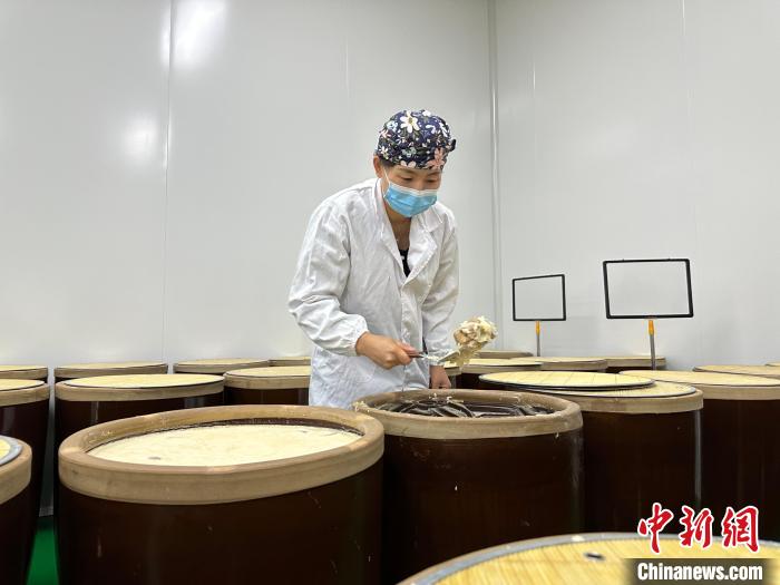图为4月底,“80后”厨娘王晓娟在查验古法腌缸肉的品质。冯志军 摄