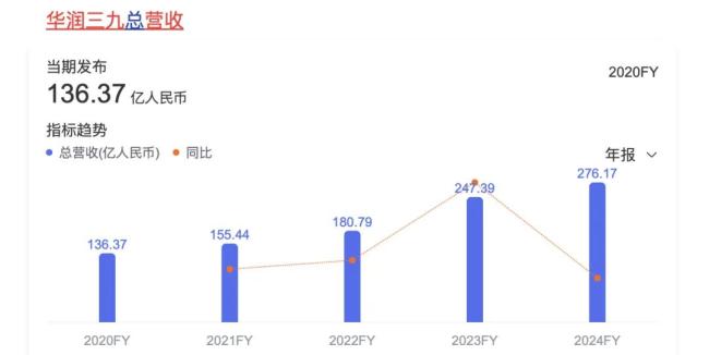华润三九的“十四五”营收目标是实现营收翻番‌。其在2020年提出了这一目标,彼时,华润三九的营收为136.37亿元;2021年营收为155.44亿元,2024年达到276.17亿元。如果收入翻番,则需要其营收达到300亿元以上。