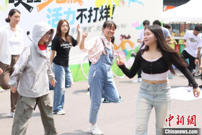 5月22日,江苏南京,大学生跟着音乐跳集体舞。中新社记者 泱波 摄