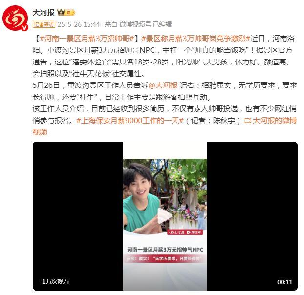 近日,河南洛阳重渡沟景区发布了一则招聘启事,月薪3万元寻找一位帅气的NPC,职位名为“潘安体验官”。该职位要求应聘者为18至28岁的阳光帅气大男孩,不仅颜值高、体力好,还要会拍照,并具备出色的社交能力。