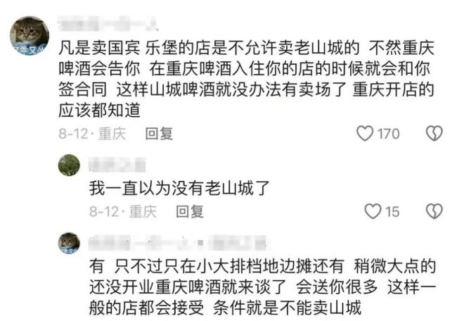 还有重庆网友爆料称,“凡是卖国宾、乐堡的店是不允许卖老山城的,不然重庆啤酒会告你,在重庆啤酒入住你的店的时候就会和你签合同,这样山城啤酒就没办法有卖场了,重庆开店的应该都知道。”