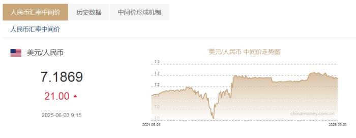 6月3日人民币对美元中间价报7.1869元 下调21个基点