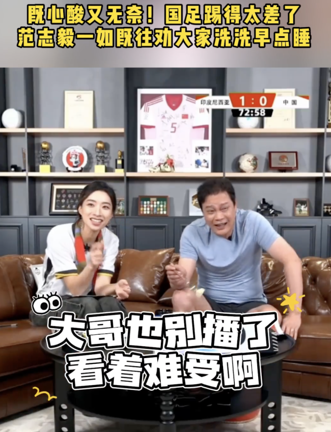 范志毅失望劝球迷早点睡。范志毅在国足表现不佳后劝球迷早点休息,称“大哥也别播了,看着难受啊,早点休息吧”。