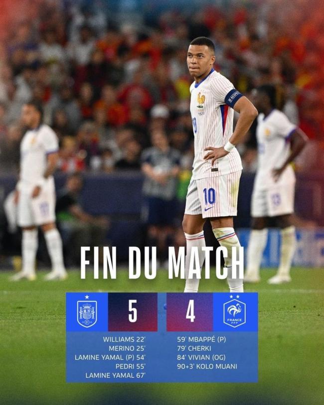 法国队加强攻势,但未能取得进球。第31分钟,特奥禁区左侧倒三角传球,姆巴佩迎球抽射被赫伊森挡出。第37分钟,杜埃内切斜传,登贝莱小角度劲射未能攻破西蒙防守的球门。第44分钟,西班牙队踢出娴熟配合,亚马尔送出过顶长传,佩德里头球回敲,赫伊森凌空扫射直挂死角,可惜越位被判无效,西班牙队带着2球优势进入更衣室。