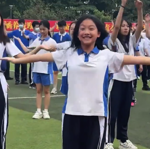 女孩做课间操似灵魂舞者,笑容满面地完成每个动作