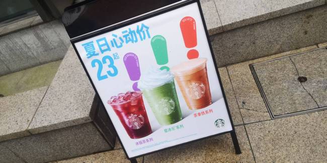 日前,针对“下午或傍晚想喝一杯,又可能担心咖啡因摄入问题”的消费者,星巴克打造“上午咖啡,下午非咖”的消费理念,对非咖产品进行了降价,降幅在2-6元。6月10日,是星巴克“夏日心动价”活动的第一天。中华网财经注意到,在星巴克门口,店员已经早早在门口放上了“夏日心动价23元起”的海报。