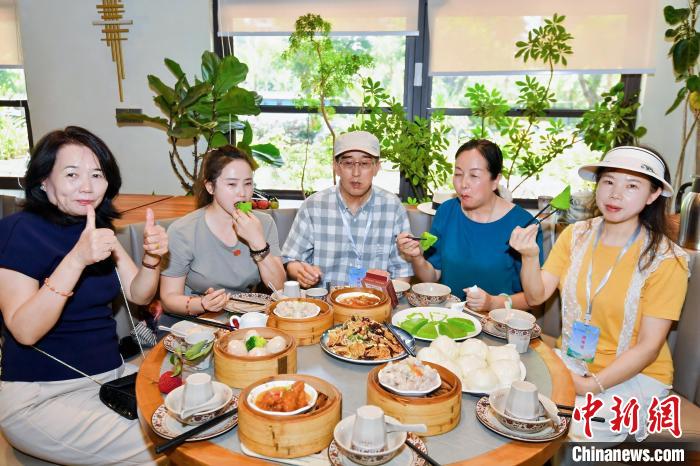 6月11日,参加何以中国·行走海南——海外华媒解锁HainanTravel活动的境外华文媒体人士、外籍博主在海口南珍茶楼品尝老爸茶。(海南省国际文化交流中心 供图)