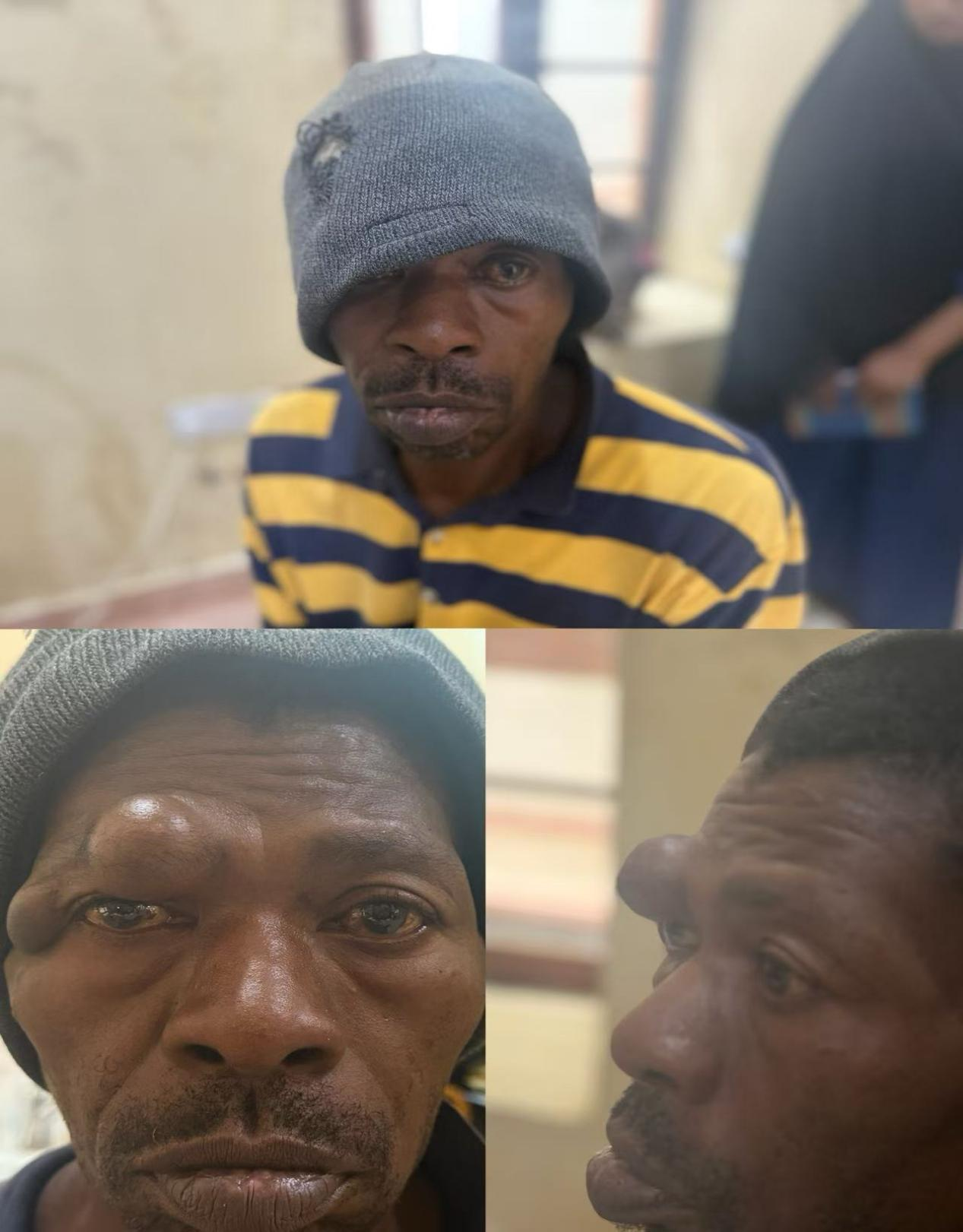 患者术前,两枚肿块压迫眼睑。中国援桑医疗队供图