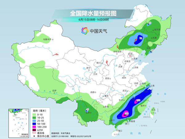 后天,内蒙古东部、江南中东部和南部、华南中北部等地部分地区有大到暴雨,其中,江西东部、广东北部等地部分地区有大暴雨,广东北部等地局地特大暴雨。