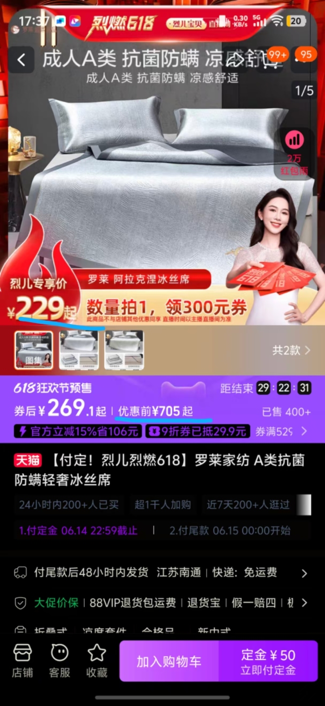 记者调查发现,罗莱凉席页面主图显示“专享价229元起,定金50元”,但未标明大尺寸价格,且定金是否包含在总价内也模糊不清。记者选择1.8×2m尺寸并加购,购物车明细显示“定金50元,券后(含定金)246.1元”。支付定金后,订单显示尾款为246.1元,价格发生变化,贵了50元。明码标价“含定金”付款后变成了“不含”。
