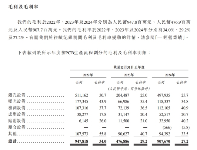 作为营收占比超6成的核心产品,钻孔设备的毛利率变化或直接左右公司盈利水平。招股书数据显示,2022年-2024年,公司钻孔设备业务的毛利率迎来三连降,从30.7%持续下滑至23.7%。与此同时,曝光设备等其他产品线毛利率同样呈下滑趋势,反映出行业竞争加剧下的整体盈利压力。