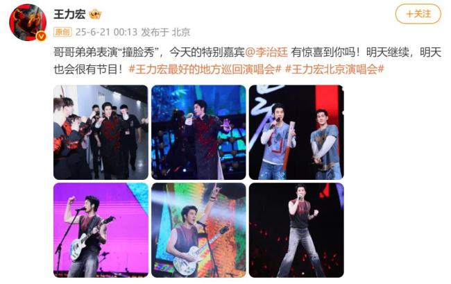 6月20日晚,在北京举办的“最好的地方巡回演唱会”上,歌手王力宏邀请李治廷作为特别嘉宾。两人身穿相似服装合唱歌曲,并设计了“真假王力宏”的互动环节。次日,王力宏在个人微博分享多张演唱会照片,称这是“哥哥弟弟表演‘撞脸秀’”,并询问粉丝是否感到惊喜。
