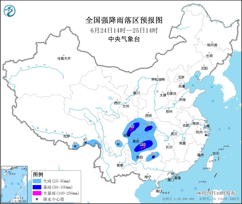 预计,6月24日14时至25日14时,陕西南部、四川盆地、重庆、贵州、湖北西部、湖南西部、广西北部、浙江东部以及云南西北部、西藏东南部等地部分地区有大到暴雨,其中,四川盆地西部、贵州中北部等地局地有大暴雨(100~150毫米);上述部分地区伴有短时强降水(最大小时降雨量20~50毫米,局地可超过60毫米),局地有雷暴大风等强对流天气。