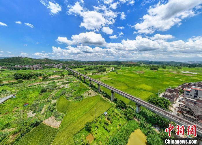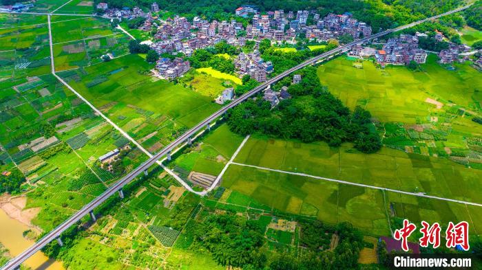 近日,广西梧州市万秀区夏郢镇凤凰村一带,绿意盎然的田园与错落的民居、蜿蜒的村道、清澈的河流以及穿行其间的铁路相映成趣,勾勒出一幅和美乡村新画卷。何华文 摄