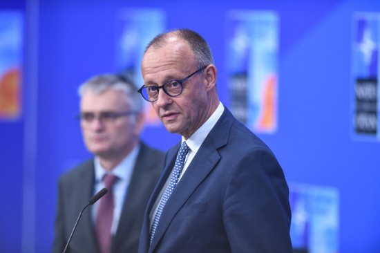 6月25日,在荷兰海牙,德国总理默茨在北约峰会期间对媒体记者讲话。新华社记者彭子洋摄