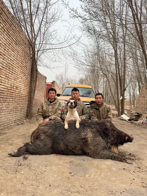 “一猪二熊三老虎”,野猪体型大、獠牙长,皮糙肉厚攻击力强。这几年,刘军强护农队捕获的野猪大多在一两百斤左右,但也曾捕获过三只400多斤的野猪,其中最重的达到446斤。黄土高原沟壑纵横,有垂直的陡坡,林子里还有带刺的枝条,有时走投无路的野猪会选择跳崖,对不熟悉地形的人和猎犬来说更是凶险万分。