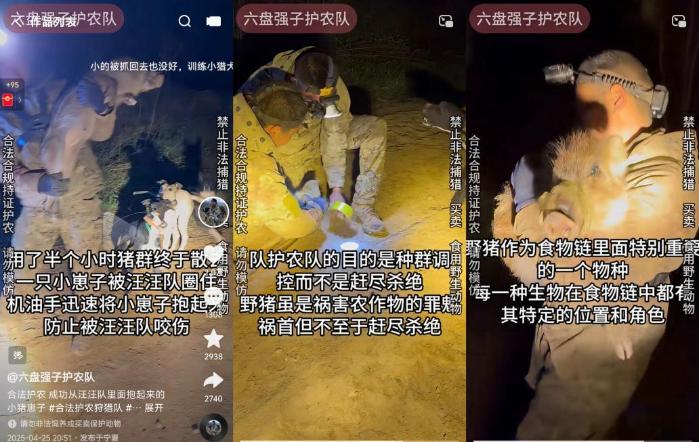“佩奇”“机油手”“下货”,都是护农队直播间的专属用语,“佩奇”代指野猪,“下货”是完成目标,如果把野猪心脏比作发动机,鲜血比作机油,最后捕杀野猪的猎手就是“机油手”。