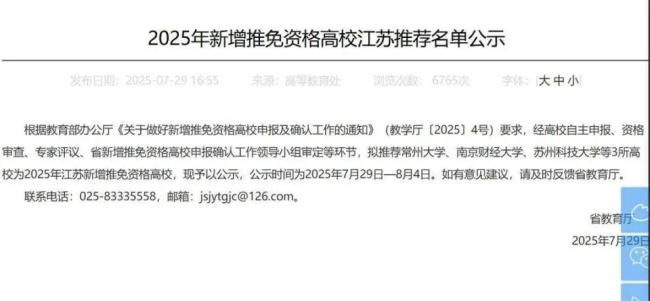 7月29日,江苏省教育厅发布新增推免资格高校推荐名单,拟推荐常州大学、南京财经大学、苏州科技大学为2025年江苏新增推免资格高校。在此之前,江苏省已有南京大学、东南大学、南京航空航天大学等25所高校具备推免资格。