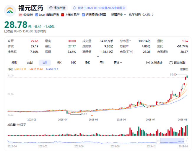 8月4日,福元医药涨停,收报29.19元/股,最新市值达140.1亿元,公司收获五天三板,7月份以来股价累计涨幅达75%,自4月8日的股价低点以来更是大涨110.15%。