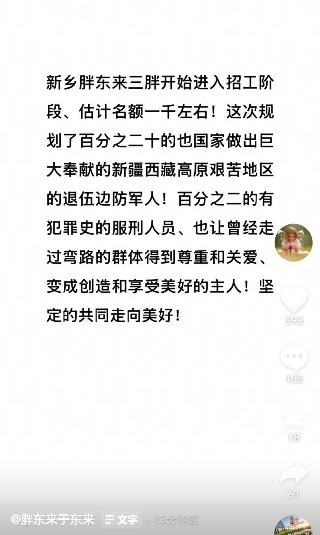 即将招工的新乡胖东来三胖备受关注。于东来透露,此次招工规划有特别安排,其中百分之二十的名额将分配给在新疆、西藏高原艰苦地区做出巨大奉献的退伍边防军人。他表示,这些退伍军人长期坚守在艰苦地区,为国家安全稳定付出了青春和汗水,他们值得拥有这样的机会,开启新的职业篇章。另外,还有百分之二的名额面向有犯罪史的服刑人员。于东来认为,曾经犯过错的人也应该有重新开始的机会,希望通过提供工作岗位,给予这些走过弯路的群体尊重和关爱,让他们能够依靠自己的劳动创造价值,重新融入社会,拥抱美好的生活。