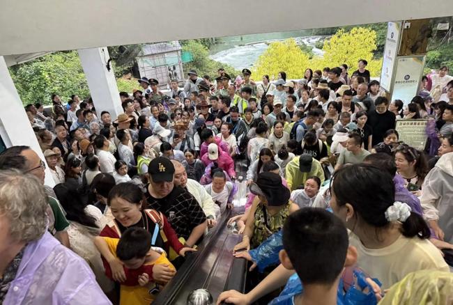 黄果树景区的大扶梯号称全亚洲最大的野外观光扶梯,全长170米,提升高度80米,乘坐时长约5分钟。由于扶梯停运,大量游客被迫滞留。有游客自嘲道:“瞬倾盆大雨,山里电闪雷鸣,电梯还停了,管你是要客还是普客,统统徒步走上去。这哪是看西游记的取景地,这是经历了一次取经路。”