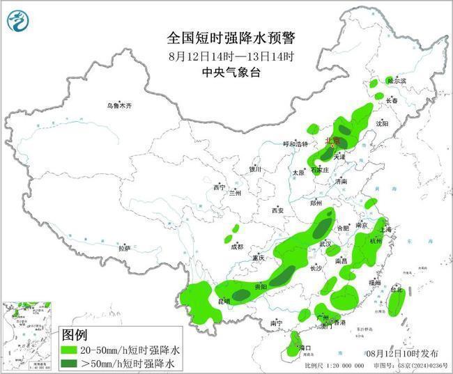预计8月12日14时至13日14时,内蒙古东南部、华北中北部、西南地区东部、江南东部等地的部分地区将有8级以上雷暴大风或冰雹天气。北京北部、天津北部等地的部分地区将有10级以上雷暴大风,最大风力可达11级以上。同时,内蒙古东部、华北中北部、江淮西部、江汉、江南西北部和中东部、西南地区东部和南部、华南东部和南部等地的部分地区将有小时雨量大于20毫米的短时强降水天气。河北中部和东北部、北京西南部和北部、天津北部、河南南部、湖北北部、湖南西部、贵州东南部和西南部、云南东部等地的部分地区小时雨量大于50毫米,最大可达70毫米以上。