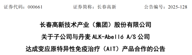 9月17日,长春高新技术产业(集团)股份有限公司发布公告称,其核心子公司长春金赛药业有限责任公司(以下简称“金赛药业”)与全球过敏治疗巨头丹麦爱而开公司达成战略合作,引进三款变应原特异性免疫治疗产品。