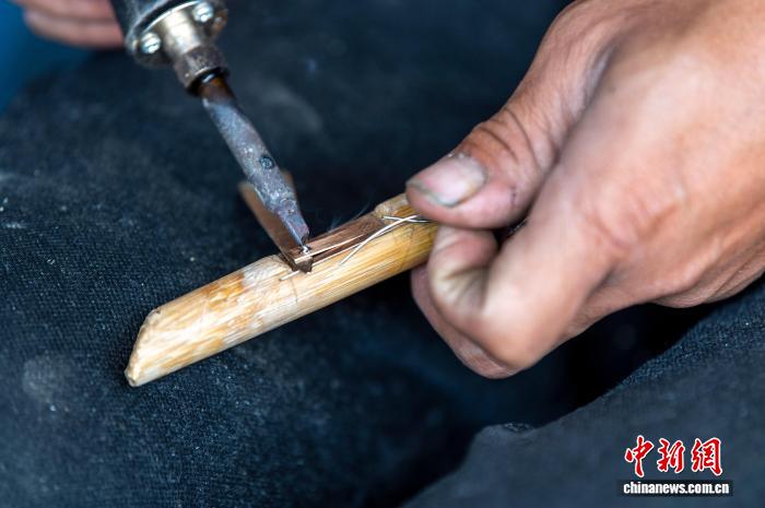 图为芦笙制作手艺人梁光林在给芦笙管簧片焊锡。吴德军 摄