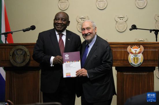11月4日,在南非立法首都开普敦,二十国集团应对全球不平等问题特别独立专家委员会主席、诺贝尔经济学奖得主约瑟夫·施蒂格利茨(右)向南非总统拉马福萨提交关于全球不平等问题的报告。新华社发(沙姬拉·泰比摄)