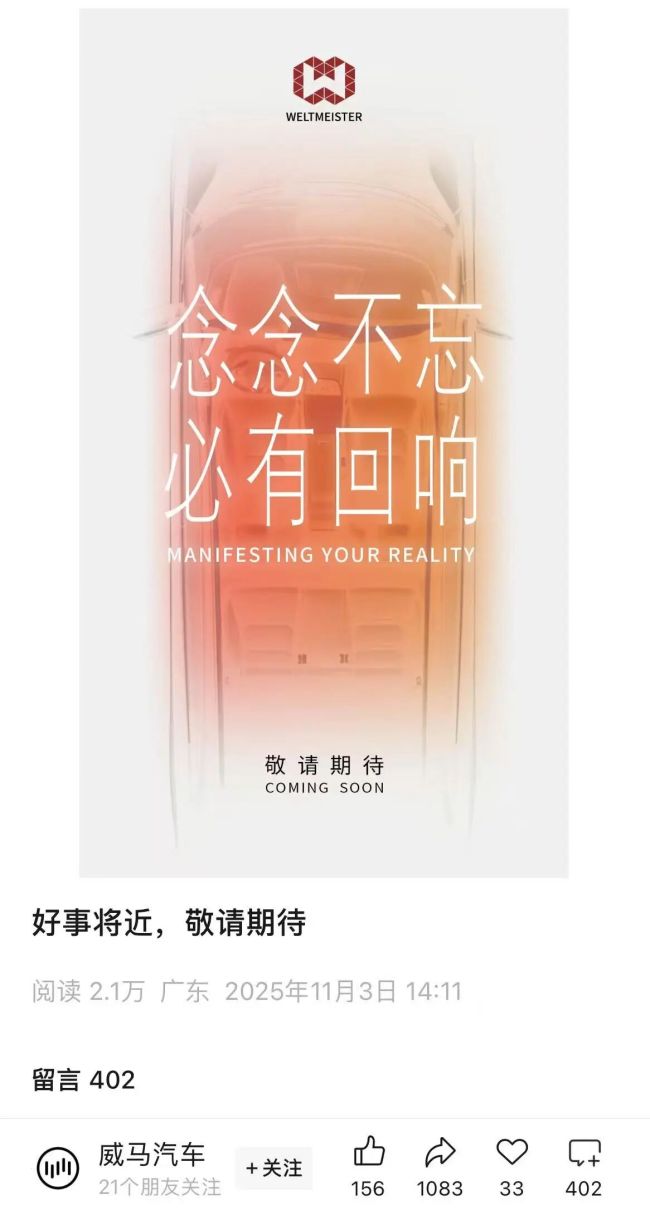 11月3日上午,威马汽车通过官方公众号发布了一张海报:“好事将近,敬请期待”。有知情人士对媒体报道称,前述“好事”涉及多方面,包括产品、网络、供应商等,“基本上什么都有。”相关售后人士则透露,目前售后还没完全恢复,但售后团队已上岗,后续还需要全国建网,系列工作还在继续推进中。