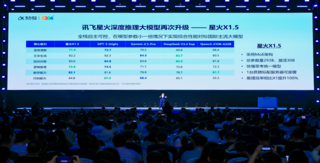 作为本次发布的核心产品——深度推理大模型讯飞星火X1.5在语言理解、文本生成、知识问答、逻辑推理、数学能力、代码能力等六大核心能力全面对标国际主流。其在数学能力上持续领先,多语言支持覆盖超过130种语种,整体性能达到GPT-5的95%以上,尤其在拉美、东盟等14个重点语言区域表现优异,为全球AI发展提供了“第二选择”。