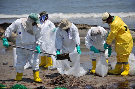 照片拍摄于2010年5月24日,在美国路易斯安那州南部的佛琼港,清洁工人正在清理海滩上的油污。新华社记者张军摄