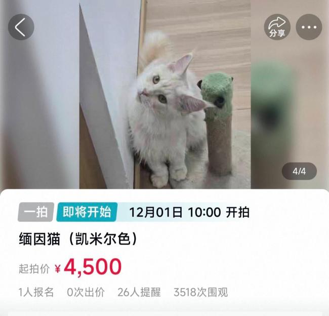11月24日,在阿里资产平台上,一只凯米尔色缅因猫被挂出拍卖,起拍价为4500元。该拍卖吸引了3000多人次围观,目前已有一个人报名竞拍。