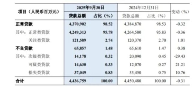 2025年三季报显示,截至报告期末,民生银行资产总额7.873万亿元,比上年度末增加0.74%。其中,发放贷款和垫款总额44367.59亿元,比上年末下降137.21亿元,降幅0.31%;个人贷款和垫款总额较上年末减少3.17个百分点。