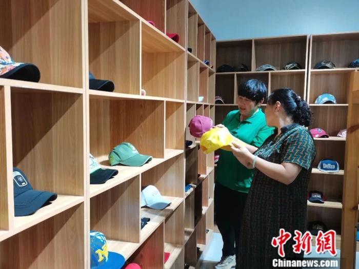 上合美谷招商促进中心内,消费者正在选购款式多样的帽子。侯效玲 摄