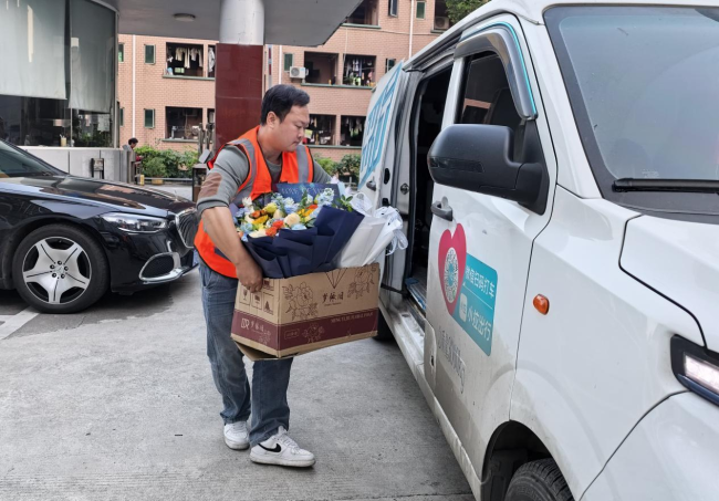 (货拉拉司机阮会文正在搬运鲜花)