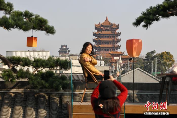 2月12日,湖北武汉,春节将至,武昌古城斗级营街区张灯结彩,处处洋溢着喜庆祥和的节日氛围。街区精心打造“抬头见黄鹤楼”的特色打卡场景,还可与武汉长江大桥同框,吸引大批市民游客前来打卡游玩。图为游客在青瓦斜坡屋顶的露台上拍照,背景是武汉黄鹤楼。中新社记者 张畅 摄