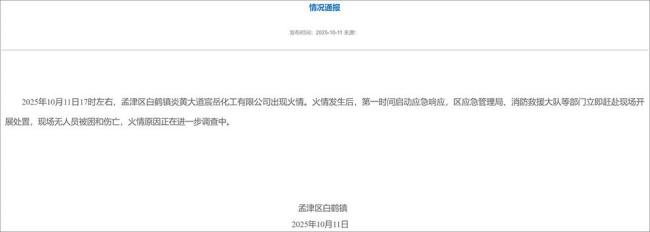10月11日17时左右,河南省洛阳市孟津区白鹤镇炎黄大道宸岳化工有限公司发生火情。火情发生后,当地政府迅速启动应急响应机制,区应急管理局和消防救援大队等部门立即赶往现场进行处置