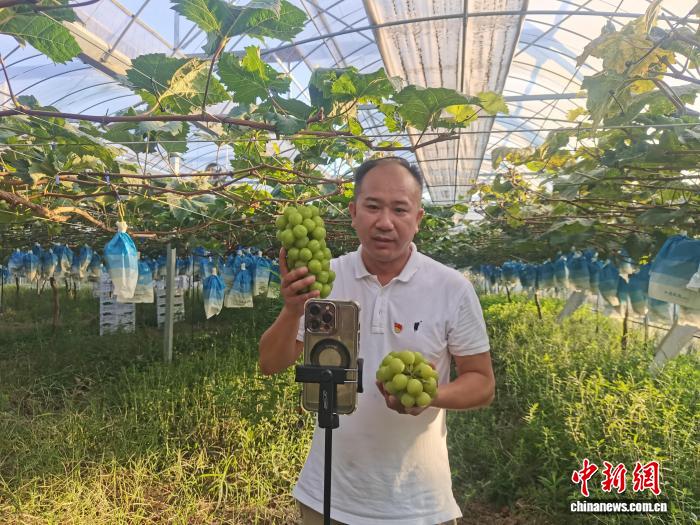 中新网绍兴9月18日电 (张益聪 徐杭惠)“今天我们直播间近距离看一看绿色防虫、不打农药的有机葡萄,让大家吃得放心。”近日,在浙江省绍兴市上虞区叶氏兄弟丁宅阳光玫瑰基地,虞南乡亲、网络达人俞荣军开启了手机直播