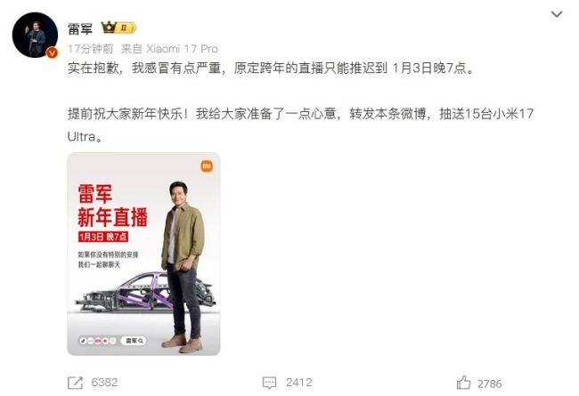 小米集团董事长雷军发文称,感冒有点严重,原定跨年的直播推迟到1月3日晚7点。