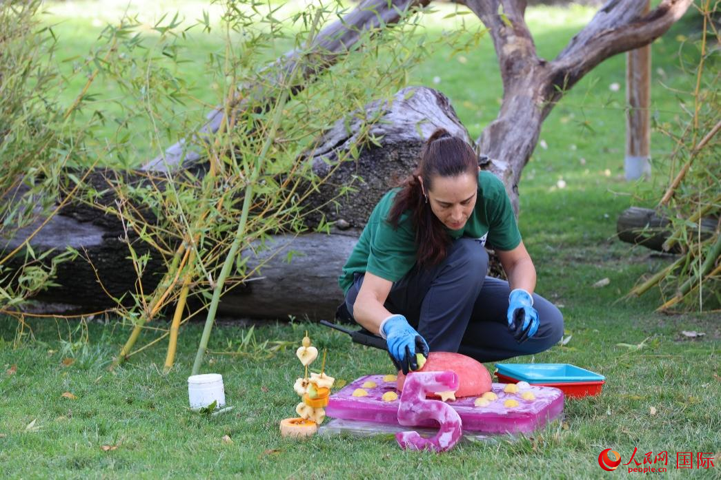 人民网马德里9月20日电(记者许海林、颜欢)当地时间9月20日,西班牙马德里动物园为去年4月抵达马德里的大熊猫“金喜”和“茱萸”举办生日会,庆祝它们的5岁生日。众多提前得到生日会消息的民众一早就在动物