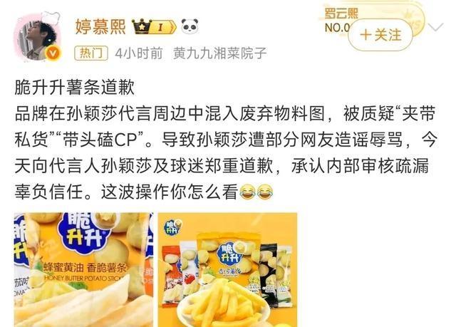 孙颖莎因为一包薯条陷入了舆论风波,连官媒《东方体育日报》都进行了点名,事情变得微妙起来。起因是国产薯条品牌“脆升升”邀请孙颖莎代言,但在制作周边产品时出了问题,把一些印错的废弃物料发了出去