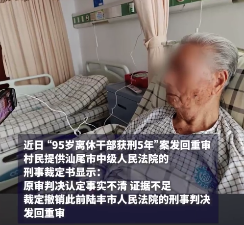 近日,“95岁离休干部获刑5年”案发回重审。广东汕尾市中级人民法院的刑事裁定书显示,原审判决认定事实不清,证据不足,裁定撤销此前陆丰市人民法院的刑事判决,发回重审。此前报道,公诉方指控,2004年郑蔚纠集其家乡12位村民组成恶势力犯罪团伙,...