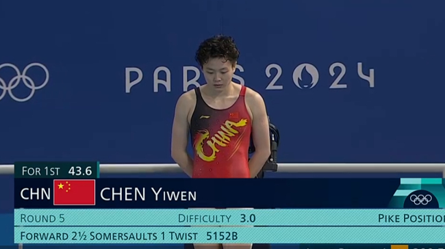 陈艺文在第十四届全运会女子单人三米板决赛中,最后一跳以76.50分的成绩稳居第一。‌决赛表现根据赛事报道,陈艺文在决赛中展现了稳定的技术水平。最后一跳选择的是5152B动作,该动作难度系数较高,但她完成得干净利落,裁判打出76.50分。这一...