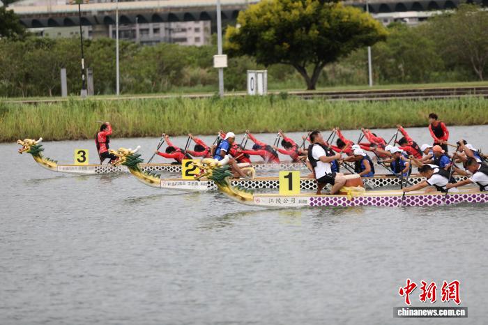 中新社新北9月23日电 (记者 朱贺)尽管台风“桦加沙”过境台湾裹挟着阵风和零星小雨,2025两岸城市龙舟交流赛23日在新北市微风运河上如约举行。来自新北市、台北市、上海市、南京市、苏州市的11支队伍、272名龙舟好手